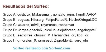 Lista de participantes: Makissima_, gmorales_9, kotii_cc, JorgeeIgnacioR, orlvill, FondHAARP, nicoiub, ZippoMontt, alejofloresq, gonzalo_egm, rorro_ohi, custicox, robsanvar, roycronos, M_Hernandez_cc, FelipeRatedR, segoas, sedtorres, chussir, Niferarg, angelogotell, wuares, NachoOrtegaLDC, ramirescl.