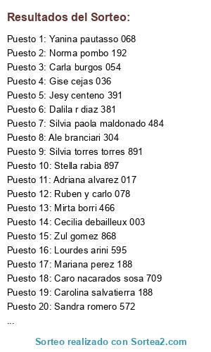 Lista de participantes: Caro nacarados sosa 709 , Patricia ponzio 952 , Stella rabia 897 , Day Rodriguez 371 , Lourdes arini 595 , Dalila r diaz 381 , Sandra romero 572 , Cecilia debailleux 003 , Mirta borri 466 , Zul gomez 868 , Claudia gonzales 594 , Maria florencia torres 135 , Ale branciari 304 , Mariana perez 188 , Silvia paola maldonado 484 , Yanina pautasso 068 , Silvia torres torres 891 , Jesy centeno 391 , Norma pombo 192 , Sele aguero 121 , Gise cejas 036 , Carla burgos 054 , Carolina salvatierra 188 , Adriana alvarez 017 , Ruben y carlo 078 , .