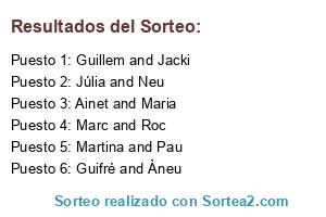 Lista de participantes: Guifré and Àneu , Júlia and Neu , Marc and Roc , Guillem and Jacki , Ainet and Maria , Martina and Pau , .