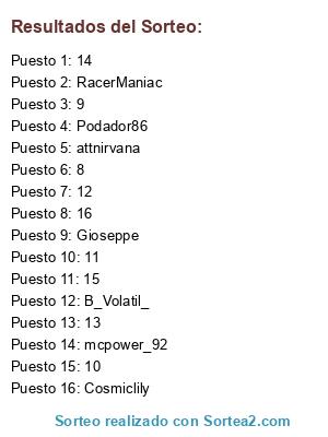 Lista de participantes: mcpower_92, Podador86, Cosmiclily, B_Volatil_, Gioseppe, RacerManiac, attnirvana, 8, 9, 10, 11, 12, 13, 14, 15, 16.