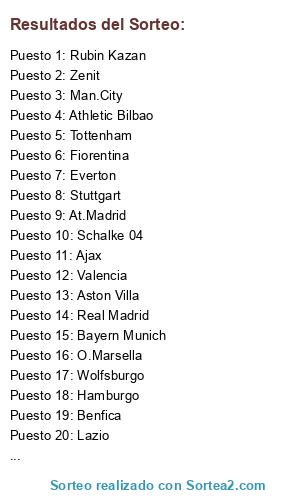 Lista de participantes: Athletic Bilbao, Inter Milan, Schalke 04, Juventus, Valencia, Zenit, Everton, Werder, Oporto, Rubin Kazan, Man.United, Liverpool, Stuttgart, Roma, Wolfsburgo, Galatasaray, Man.City, Hamburgo, Benfica, At.Madrid, Fiorentina, Real Madrid, Sevilla, Ajax, Bayern Munich, O.Lyon, Tottenham, Aston Villa, Villarreal, O.Marsella, Bayern Leverkusen, Lazio.