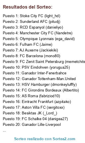 Lista de participantes: FC Zenit Saint Petersburg (memetchite7), Stoke City FC (light_hd), Ganador Mallorca-Borussia Dortmund, Ganador Tottenham-Man.United, RCD Espanyol (danieliyo), Bayer 04 Leverkusen (FSSR!!), Eintracht Frankfurt (azpitako), FC Barcelona (mono80), Fulham FC (Jaime), FC Bayern München (pi69tu), Manchester City FC (Nandetre), PAOK FC (jandroooo), AJ Auxerre (Jackiekiki), HSV Hamburger (dmonkeylufffy), Sunderland AFC (pitudj), AC Milan (pedrozidane92), FC Schalke 04 (danigea27), Ganador Inter-Fenerbahce, SSC Napoli (ReeLo), Aston Villa FC (sergitoxx), Paris Saint-Germain (carloxdim1), Besiktas JK (_Lord_), AS Roma (fabriziod10), FC Girondins Bordeaux (Albertito), PSV Eindohven (yorugua25), Olympique Lyonnais (ega_david), Real Madrid CF (varomt), FC Porto (patzytoro), Juventus FC (borjilla87), Olympiakos FC (daviolico9), Chelsea FC (wolverine_rms), Ganador Lille-Liverpool.