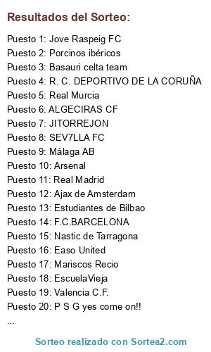 Lista de participantes: Mariscos Recio, Jove Raspeig FC, Ajax de Amsterdam, Arsenal, Basel, Valencia C.F., F.C.BARCELONA, Nastic de Tarragona, Botafogo, Criciuma E.C., Córdoba AB, Manchester City, Estudiantes de Bilbao, Easo United, CF Monterrey 🇲🇽, ADN Futbol, Monaco, Porcinos ibéricos, Schalke 04, Real Murcia, Málaga AB, R. C. DEPORTIVO DE LA CORUÑA, P S G yes come on!!, EscuelaVieja, Real Madrid, A. C. Milán, SEV7LLA FC, ALGECIRAS CF, JITORREJON, Basauri celta team, BORINKEN FC, Montedio Yamagata.