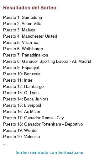 Lista de participantes: Zaragoza, Arsenal, Girondins, Sampdoria, Borussia, Manchester United, Ganador Roma - City, Inter, Boca Juniors, Wolfsburgo, Nápoles, Villarrreal, Betis, Ac Milan, Ganador Tottenham - Deportivo, Hamburgo, Stuttgart, Valencia, Werder, Bayern, Benfica, Aston Villa, Schalke 04, O. Lyon, Panathinaikos, Ganador Sporting Lisboa - At. Madrid, Malaga, Espanyol, PSV, Liverpool, Ajax, Chelsea.