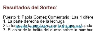 - Ganador: Paola Gomez Comentario: Las 4 diferencias son: 1. La parte derecha de la lechuga 2.la forma de la punta izquierda del queso tajado. 3. El color de la bolita del queso sobre la hamburguesa. 4. El polvo sobre la parte superior del pan.