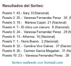 Lista de participantes: 1.- Nuria Bueno. 2 (Nacional), 2.- Nuria Bueno. 3 (Nacional), 3.- Nuria Bueno. 4 (Nacional), 4.- Nuria Bueno. 5 (Nacional), 5.- by Jiab. 6 (Nacional), 6.- by Jiab. 7 (Nacional), 7.- El chico con cianuro. 8 (Nacional), 8.- El chico con cianuro. 9 (Nacional), 9.- Ana María Duarte. 10 (Nacional), 10.- Ana María Duarte. 11 (Nacional), 11.- Celia CL. 12 (Nacional), 12.- Kristen. 13 (Nacional) , 13.- Athenna. 14 (Nacional) , 14.- Athenna. 15 (Nacional) , 15.- Awixumayita Atiyamuxiwa . 16 (Nacional) , 15.- Awixumayita Atiyamuxiwa . 17 (Nacional) , 16.- Mª Jesús Fdez . 18 (Nacional), 17.- Mª Jesús Fdez . 19 (Nacional), 18.- Marissa Cazpri. 20 (Nacional), 19.- Marissa Cazpri. 21 (Nacional), 20.- Lilium. 22 (Nacional), 21.- Lilium. 23 (Nacional), 22.- Lilium. 24 (Nacional), 23.- Vanessa Fernandez Perez . 28 (Nacional), 24.- Vanessa Fernandez Perez . 29 (Nacional), 25.- Vanessa Fernandez Perez . 30 (Nacional), 26.- Carmen Garcia Magadan. 31 (Nacional), 27.- Carmen Garcia Magadan. 32 (Nacional), 28.- Carmen Garcia Magadan. 33 (Nacional), 29.- Carolina Vivo Galvez. 34(Nacional), 30.- Carolina Vivo Galvez. 35 (Nacional), 31.- Carolina Vivo Galvez. 36 (Nacional), 32.- Carolina Vivo Galvez. 37 (Nacional), 33.- Gema Azuki. 38 (Nacional), 34.- Gema Azuki. 39 (Nacional), 35.- Entre libros. 40(Nacional), 36.- Entre libros. 41(Nacional), 37.- Entre libros. 42 (Nacional), 38.- Entre libros. 43 (Nacional), 39.- Luisa9804. 44(Nacional), 40.- Luisa9804. 45 (Nacional), 41.- Luisa9804. 46 (Nacional), 42.- Sary. 50(Nacional), 43.- Sary. 51(Nacional), 44.- Sary. 52(Nacional).
