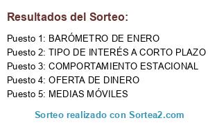 Lista de participantes: iNDICADOR DEL MOMENTO , OSCILADOR DE FUERZA INTERNA , INDICE DE AMPLITUD ABSOLUTA , DIA DEL MES Y DÍA DEL AÑO , BARÓMETRO DE ENERO , MEDIAS MÓVILES , COMPORTAMIENTO ESTACIONAL , EFECTO DE LOS DIVIDENDOS , EFECTO DE LAS VACACIONES , OFERTA DE DINERO , TIPO DE INTERÉS A LARGO PLAZO , TIPO DE INTERÉS A CORTO PLAZO , INDICADOR DE VOLUMEN , VALOR ESTRELLA , INDICADOR DE SOBRECOMPRA Y SOBREVENTA.