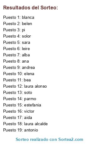 Lista de participantes: aida, alba, ana, andrea, bea, belen, antonio, blanca, elena, estefania, laura alonso, laura alcalde, leire, parmo, pi, sara, solor, soto, victor, xei.