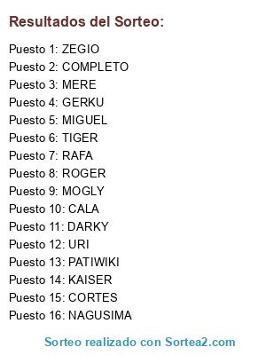 Lista de participantes: MOGLY, MERE, ROGER, CORTES, KAISER, PATIWIKI, CALA, ZEGIO, GERKU, NAGUSIMA, COMPLETO, DARKY, RAFA, URI, TIGER, MIGUEL.