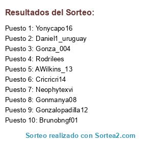 Lista de participantes: Daniel1_uruguay, Gonza_004, Rodrilees, Cricricri14, Yonycapo16, Neophytexvi, Brunobngf01, AWilkins_13, Gonzalopadilla12, Gonmanya08.