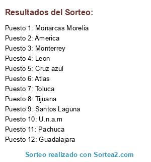 Lista de participantes: America, Atlas, Cruz azul, Guadalajara, Leon, Monarcas Morelia, Monterrey, Pachuca, Santos Laguna, Tijuana, Toluca, U.n.a.m.