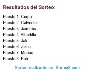 Lista de participantes: Albertillo, Calvente, Corpa, Jaimebs, Jak, Munox, Poti, Zizou.