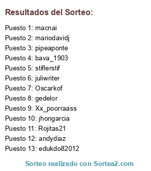 Lista de participantes: stiflerstif, bava_1903, Oscarkof, pipeaponte, jhongarcia, gedelor, edukdo82012, mariodavidj, Rojitas21, juliwriter, macnai, Xx_poorraass, andydiaz.