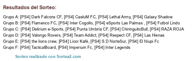 Lista de participantes: [PS4] Las Hienas , [PS4] ChiringuitoBull, [PS4] CaeluM FC, [PS4] Dark Falcons CF, [PS4] Valongo Rovers, [PS4] Futbol Lindo, [PS4] Team Addict, [PS4] Inter Cogollo, [PS4] Licor Kafé, [PS4] El Niupi Fc, [PS4] eSports Las Palmas , [PS4] Galaxy Shadow, [PS4] TacticalBoard, [PS4] the lions crew, [PS4] Respect CF, [PS4] Lethal Army, [PS4] Imperium Fc, [PS4] Punta Umbría CF, [PS4] Delirium e-Sports, [PS4] Inter Legends, [PS4] Flamenco FC, [PS4] S.D NorteSur, [PS4] RAZA ROJA.