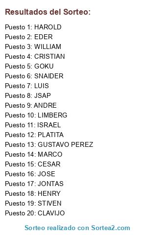 Lista de participantes: EDER, GOKU, LUIS, ANDRE, CESAR, GUSTAVO PEREZ, HAROLD, HENRY, CLAVIJO, JOSE, JSAP, LIMBERG, MARCO, SNAIDER, STIVEN, ISRAEL, WILLIAM, JONTAS, CRISTIAN, PLATITA.