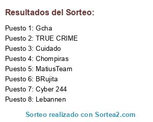 Lista de participantes: Chompiras, Cuidado, TRUE CRIME, Gcha, BRujita, Lebannen, MatiusTeam, Cyber 244.