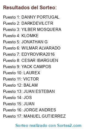 Lista de participantes: JOS, LAUREX, EDYROVIRA2016, DARKDEVILCTR, VICTOR, MANUEL GUTIERREZ, KLOMKE, JONATHAN G, CESAR IBARGUEN, JORGE ANDRES, JUAN ESTEBAN, YILBER MOSQUERA, JUAN, WILMAR ALVARADO, YACK CAMPOS, DANNY PORTUGAL, BALAM.