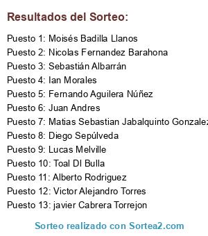 Lista de participantes: Nicolas Fernandez Barahona, Alberto Rodriguez, Matias Sebastian Jabalquinto Gonzalez, Fernando Aguilera Núñez, Juan Andres, Lucas Melville, Moisés Badilla Llanos, javier Cabrera Torrejon, Toal Dl Bulla, Ian Morales, Sebastián Albarrán, Diego Sepúlveda, Victor Alejandro Torres.