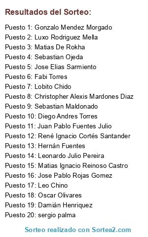 Lista de participantes: Gonzalo Mendez Morgado, Christopher Alexis Mardones Diaz, Jose Elias Sarmiento, sergio palma, Leonardo Julio Pereira, Juan Pablo Fuentes Julio, Jose Pablo Rojas Gomez, Leo Chino, Sebastian Maldonado, Oscar Olivares, Fabi Torres, René Ignacio Cortés Santander, Luxo Rodriguez Mella, Sebastian Ojeda, Diego Andres Torres, Lobito Chido, Damián Henriquez, Hernán Fuentes, Matias Ignacio Reinoso Castro, Matias De Rokha.