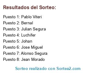 Lista de participantes: Johan, Alonso Segura, Julian Segura, Jose Miguel, Luchifer, Bernal, Jean Morado, Pablo Viteri.