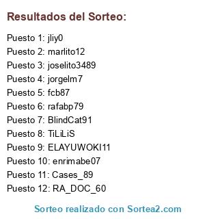 Lista de participantes: BlindCat91, Cases_89, ELAYUWOKI11, enrimabe07, fcb87, jliy0, jorgelm7, joselito3489, marlito12, RA_DOC_60, rafabp79, TiLiLiS.