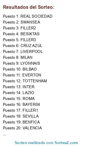 Lista de participantes: VALENCIA, INTER, NAPOLI, BILBAO, BAYER04, FILLER1, FILLER2, LYONNAIS, ROMA, BESIKTAS, REAL SOCIEDAD, MILAN, SEVILLA, EVERTON, LAZIO, CRUZ AZUL, TOTTENHAM, SWANSEA, LIVERPOOL, BENFICA, ZENIT, FILLER3.
