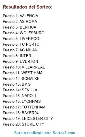 Lista de participantes: SCHALKE, LEICESTER CITY, BENFICA, LIVERPOOL, EVERTON, FC PORTO, STOKE CITY, WEST HAM, AC MILAN, BAYER04, TOTTENHAM, BMG, SEVILLA, AS ROMA, INTER, VILLARREAL, NAPOLI, VALENCIA, WOLFSBURG, LYONNAIS.