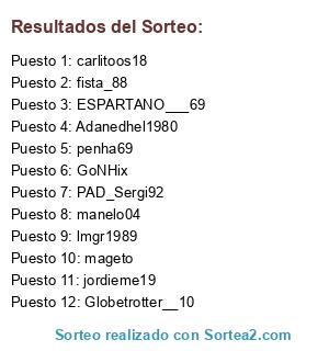Lista de participantes: MexicoMaster_DT, AdRiiPO95, sebastopol_81, bricioo1996, CR.CHUANO, AlbertoOlmo1995, Gabiii17, Jona25, yo el ricardo, kidvegan, sergio posse, COMPUTER.