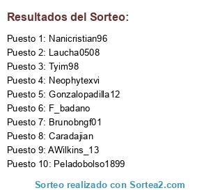 Lista de participantes: Nanicristian96, Peladobolso1899, Caradajian, Tyim98, Brunobngf01, F_badano, Neophytexvi, Gonzalopadilla12, AWilkins_13, Laucha0508.