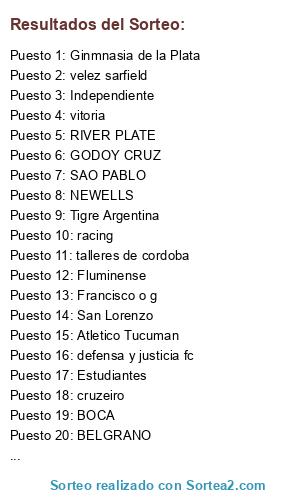 Lista de participantes: SAO PABLO, talleres de cordoba, Atletico Tucuman, PATRONATO, Tigre Argentina, BELGRANO, Fluminense, defensa y justicia fc, Estudiantes, TEMPERLEY, NEWELLS, Ginmnasia de la Plata, GREMIO, cruzeiro, Huracan, GODOY CRUZ, RIVER PLATE, Independiente, racing, Rosario Central, velez sarfield, vitoria, SANTA CRUZ FC, Olimpo, BOCA, Francisco o g, San Lorenzo, Palmeiras.