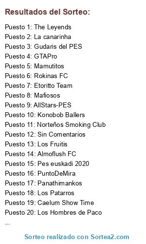 Lista de participantes: The Leyends, Konobob Ballers, Caelum Show Time, Mafiosos, Los Hombres de Paco, Matracas de la Bahia, Esp-Ectaculo, Rokinas FC, Jujañas Team, Muppet FC, Charrúas, AllStars-PES, Manchese Usted, Sin Comentarios, La canarinha, Pes euskadi 2020, Yonkis del pro, La Mina, La Mina Agresiva, GTAPro, Etoritto Team, futboldebarrio, Norteños Smoking Club, Almoflush FC, Mamutitos, PuntoDeMira, Panathimankos, Los Patarros, Los Fruitis, Gudaris del PES.