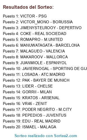 Lista de participantes: COKE - REAL SOCIEDAD, EDU - REAL MADRID, GORRII - MILAN, JIMENYSTELROOY - DEPERTIVO, PEPEDIOS - JUVENTUS, ISMAEL - MALAGA, LOSADA - ATC.MADRID, KRATOS - ARSENAL, LIDER - CHELSE, PODER NEGRITO - M.CITY, MANUWATAGATA - BARCELONA, MAKAROOV - MALLORCA, JUANMIOLE - ESPANYOL, MALAGUEO - VALENCIA, JAVIERNOGAL - SPORTING DE GIJON, PAK - BAYER DE MUNICH, VR46 - ZENIT, VICTOR - PSG, VICTOR_MONO - BORUSSIA, ROMAPRO - M.UNITED.
