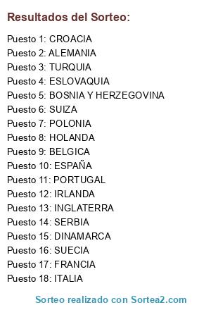 Lista de participantes: BELGICA, INGLATERRA, FRANCIA, ALEMANIA, ITALIA, HOLANDA, PORTUGAL, ESPAÑA, CROACIA, DINAMARCA, IRLANDA, POLONIA, SERBIA, SUIZA, TURQUIA, ESLOVAQUIA, BOSNIA Y HERZEGOVINA, SUECIA.