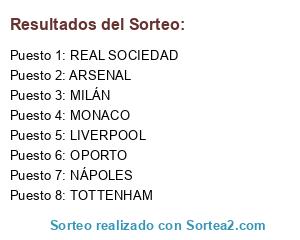 Lista de participantes: NÁPOLES, REAL SOCIEDAD, MILÁN, ARSENAL, TOTTENHAM, OPORTO, LIVERPOOL, MONACO.