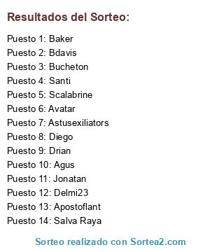 Lista de participantes: Bucheton, Drian, Jonatan, Salva Raya, Astusexiliators, Delmi23, Bdavis, Baker, Apostoflant, Diego, Avatar, Scalabrine, Santi, Agus.