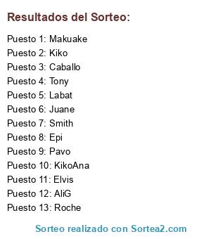Lista de participantes: Pavo, KikoAna, Roche, AliG, Juane, Kiko, Makuake, Caballo, Epi, Elvis, Tony, Smith, Labat.