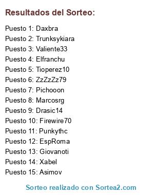 Lista de participantes: Firewire70, Xabel, Tioperez10, Daxbra, Pichooon, Punkythc, Trunksykiara, Elfranchu, Marcosrg, Giovanoti, ZzZzZz79, Asimov, Valiente33, Drasic14, EspRoma.