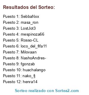 Lista de participantes: loco_del_fifa11, huachalango, mespinoza66, masa_ron, fgonzab, NashoAndres-, SebbaNxx, Milovaan, LostJot3, Rosso-CL, henra14, nako_fj.