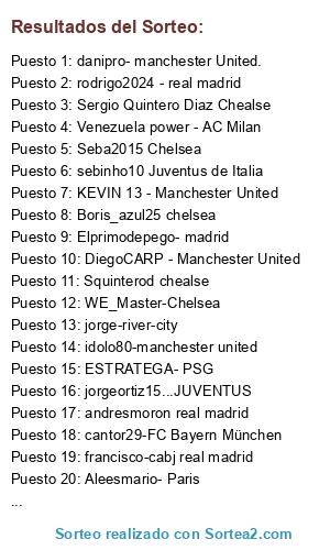 Lista de participantes: Facundoy - Manchester City, matadero2015 real madrid, Guasti Psg, Vitor Santos Canuto Bayern, Kidacchio real madrid, ManuelReinoso - Psg, andresmoron real madrid, Lk20 psg, ANGL0192 - Real Madrid, Brandon_Silveira, Real Madrid, Maurolucianoman-juventus, Raidenkiller - Barcelona, JanitoY2J - Real madrid, Ogt -- Chelsea, Chuletamx real Madrid, KEVIN 13 - Manchester United, Fernado Nadal - Real Madrid, Boris_azul25 chelsea, russitooo - real madrid, Seba2015 Chelsea, Sergio Quintero Diaz Chealse, cris15 city, Squinterod chealse, Marcecarbonero Barcelona, mou-bayer, chutix-city, jorge-river-city, Elprimodepego- madrid, Jeregrow - sevilla, DiegoCARP - Manchester United, Rodrii271-Real Madrid, fitofarais-chelsea, WE_Master-Chelsea, Aleesmario- Paris, ESTRATEGA- PSG, francisco-cabj real madrid, rodrigo2024 - real madrid, Emaiden - Barcelona FC, Venezuela power - AC Milan, Ramosquera - PSG, CRIOLLO - PSG, jorgeortiz15...JUVENTUS, nicolas23 (liverpool, danipro- manchester United., LAViscovi - Inter de Milán, idolo80-manchester united, cantor29-FC Bayern München, nick: ixcam equipo: bayern munich, sebinho10 Juventus de Italia, Kimimarofd - chelsea, mati-gti Bayern M., arku - AC Milan.