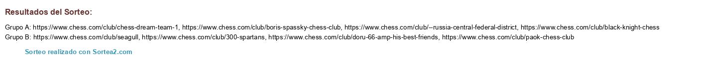 Lista de participantes: https://www.chess.com/club/chess-dream-team-1, https://www.chess.com/club/paok-chess-club, https://www.chess.com/club/boris-spassky-chess-club, https://www.chess.com/club/300-spartans, https://www.chess.com/club/seagull, https://www.chess.com/club/doru-66-amp-his-best-friends, https://www.chess.com/club/black-knight-chess, https://www.chess.com/club/--russia-central-federal-district.