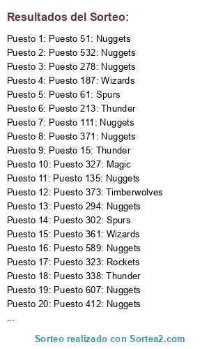 Lista de participantes: Puesto 1: Nuggets, Puesto 2: Nuggets, Puesto 3: Nuggets, Puesto 4: Nuggets, Puesto 5: Nuggets, Puesto 6: Raptors, Puesto 7: Raptors, Puesto 8: Timberwolves, Puesto 9: Raptors, Puesto 10: Nuggets, Puesto 11: Nuggets, Puesto 12: Spurs, Puesto 13: Raptors, Puesto 14: Raptors, Puesto 15: Nuggets, Puesto 16: Nuggets, Puesto 17: Nuggets, Puesto 18: Raptors, Puesto 19: Nuggets, Puesto 20: Nuggets, Puesto 21: Wizards, Puesto 22: Timberwolves, Puesto 23: Timberwolves, Puesto 24: Nuggets, Puesto 25: Nuggets, Puesto 26: Wizards, Puesto 27: Spurs, Puesto 28: Nuggets, Puesto 29: Nuggets, Puesto 30: Wizards, Puesto 31: Nuggets, Puesto 32: Nuggets, Puesto 33: Raptors, Puesto 34: Raptors, Puesto 35: Timberwolves, Puesto 36: Timberwolves, Puesto 37: Nuggets, Puesto 38: Nuggets, Puesto 39: Raptors, Puesto 40: Nuggets, Puesto 41: Nuggets, Puesto 42: Wizards, Puesto 43: Spurs, Puesto 44: Timberwolves, Puesto 45: Nuggets, Puesto 46: Nuggets, Puesto 47: Nuggets, Puesto 48: Nuggets, Puesto 49: Nuggets, Puesto 50: Spurs, Puesto 51: Nuggets, Puesto 52: Nuggets, Puesto 53: Wizards, Puesto 54: Nuggets, Puesto 55: Nuggets, Puesto 56: Timberwolves, Puesto 57: Nuggets, Puesto 58: Nuggets, Puesto 59: Nuggets, Puesto 60: Nuggets, Puesto 61: Nuggets, Puesto 62: Timberwolves, Puesto 63: Raptors, Puesto 64: Spurs, Puesto 65: Nuggets, Puesto 66: Nuggets, Puesto 67: Nuggets, Puesto 68: Nuggets, Puesto 69: Nuggets, Puesto 70: Nuggets, Puesto 71: Nuggets, Puesto 72: Nuggets, Puesto 73: Wizards, Puesto 74: Nuggets, Puesto 75: Raptors, Puesto 76: Spurs, Puesto 77: Raptors, Puesto 78: Timberwolves, Puesto 79: Nuggets, Puesto 80: Nuggets, Puesto 81: Nuggets, Puesto 82: Nuggets, Puesto 83: Nuggets, Puesto 84: Nuggets, Puesto 85: Nuggets, Puesto 86: Nuggets, Puesto 87: Timberwolves, Puesto 88: Nuggets, Puesto 89: Raptors, Puesto 90: Nuggets, Puesto 91: Nuggets, Puesto 92: Nuggets, Puesto 93: Timberwolves, Puesto 94: Nuggets, Puesto 95: Spurs, Puesto 96: Nuggets, Puesto 97: Nuggets, Puesto 98: Nuggets, Puesto 99: Nuggets, Puesto 100: Nuggets, Puesto 101: Nuggets, Puesto 102: Nuggets, Puesto 103: Spurs, Puesto 104: Timberwolves, Puesto 105: Nuggets, Puesto 106: Timberwolves, Puesto 107: Spurs, Puesto 108: Timberwolves, Puesto 109: Nuggets, Puesto 110: Nuggets, Puesto 111: Nuggets, Puesto 112: Nuggets, Puesto 113: Nuggets, Puesto 114: Nuggets, Puesto 115: Nuggets, Puesto 116: Nuggets, Puesto 117: Timberwolves, Puesto 118: Timberwolves, Puesto 119: Nuggets, Puesto 120: Nuggets, Puesto 121: Timberwolves, Puesto 122: Nuggets, Puesto 123: Spurs, Puesto 124: Nuggets, Puesto 125: Nuggets, Puesto 126: Raptors, Puesto 127: Nuggets, Puesto 128: Nuggets, Puesto 129: Nuggets, Puesto 130: Nuggets, Puesto 131: Nuggets, Puesto 132: Nuggets, Puesto 133: Nuggets, Puesto 134: Raptors, Puesto 135: Nuggets, Puesto 136: Raptors, Puesto 137: Timberwolves, Puesto 138: Spurs, Puesto 139: Nuggets, Puesto 140: Wizards, Puesto 141: Timberwolves, Puesto 142: Nuggets, Puesto 143: Timberwolves, Puesto 144: Wizards, Puesto 145: Raptors, Puesto 146: Nuggets, Puesto 147: Nuggets, Puesto 148: Spurs, Puesto 149: Nuggets, Puesto 150: Wizards, Puesto 151: Spurs, Puesto 152: Nuggets, Puesto 153: Nuggets, Puesto 154: Wizards, Puesto 155: Raptors, Puesto 156: Raptors, Puesto 157: Nuggets, Puesto 158: Timberwolves, Puesto 159: Spurs, Puesto 160: Nuggets, Puesto 161: Timberwolves, Puesto 162: Nuggets, Puesto 163: Timberwolves, Puesto 164: Nuggets, Puesto 165: Nuggets, Puesto 166: Nuggets, Puesto 167: Nuggets, Puesto 168: Raptors, Puesto 169: Nuggets, Puesto 170: Nuggets, Puesto 171: Raptors, Puesto 172: Nuggets, Puesto 173: Raptors, Puesto 174: Nuggets, Puesto 175: Nuggets, Puesto 176: Spurs, Puesto 177: Nuggets, Puesto 178: Spurs, Puesto 179: Wizards, Puesto 180: Nuggets, Puesto 181: Nuggets, Puesto 182: Nuggets, Puesto 183: Nuggets, Puesto 184: Raptors, Puesto 185: Spurs, Puesto 186: Nuggets, Puesto 187: Wizards, Puesto 188: Nuggets, Puesto 189: Nuggets, Puesto 190: Spurs, Puesto 191: Nuggets, Puesto 192: Timberwolves, Puesto 193: Nuggets, Puesto 194: Raptors, Puesto 195: Nuggets, Puesto 196: Nuggets, Puesto 197: Timberwolves, Puesto 198: Nuggets, Puesto 199: Nuggets, Puesto 200: Nuggets, Puesto 201: Nuggets, Puesto 202: Raptors, Puesto 203: Timberwolves, Puesto 204: Spurs, Puesto 205: Nuggets, Puesto 206: Timberwolves, Puesto 207: Nuggets, Puesto 208: Nuggets, Puesto 209: Timberwolves, Puesto 210: Timberwolves, Puesto 211: Timberwolves, Puesto 212: Nuggets, Puesto 213: Nuggets, Puesto 214: Raptors, Puesto 215: Wizards, Puesto 216: Raptors, Puesto 217: Spurs, Puesto 218: Spurs, Puesto 219: Raptors, Puesto 220: Raptors, Puesto 221: Nuggets, Puesto 222: Nuggets, Puesto 223: Timberwolves, Puesto 224: Nuggets, Puesto 225: Nuggets, Puesto 226: Timberwolves, Puesto 227: Raptors, Puesto 228: Wizards, Puesto 229: Nuggets, Puesto 230: Nuggets, Puesto 231: Timberwolves, Puesto 232: Timberwolves, Puesto 233: Raptors, Puesto 234: Raptors, Puesto 235: Nuggets, Puesto 236: Wizards, Puesto 237: Nuggets, Puesto 238: Spurs, Puesto 239: Nuggets, Puesto 240: Nuggets, Puesto 241: Nuggets, Puesto 242: Spurs, Puesto 243: Raptors, Puesto 244: Timberwolves, Puesto 245: Nuggets, Puesto 246: Spurs, Puesto 247: Nuggets, Puesto 248: Nuggets, Puesto 249: Nuggets, Puesto 250: Wizards, Puesto 251: Nuggets, Puesto 252: Nuggets, Puesto 253: Timberwolves, Puesto 254: Nuggets, Puesto 255: Nuggets, Puesto 256: Nuggets, Puesto 257: Raptors, Puesto 258: Nuggets, Puesto 259: Nuggets, Puesto 260: Nuggets, Puesto 261: Wizards, Puesto 262: Nuggets, Puesto 263: Nuggets, Puesto 264: Nuggets, Puesto 265: Nuggets, Puesto 266: Spurs, Puesto 267: Wizards, Puesto 268: Nuggets, Puesto 269: Nuggets, Puesto 270: Raptors, Puesto 271: Raptors, Puesto 272: Nuggets, Puesto 273: Raptors, Puesto 274: Nuggets, Puesto 275: Nuggets, Puesto 276: Spurs, Puesto 277: Nuggets, Puesto 278: Nuggets, Puesto 279: Timberwolves, Puesto 280: Nuggets, Puesto 281: Nuggets, Puesto 282: Nuggets, Puesto 283: Nuggets, Puesto 2