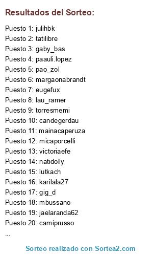 Lista de participantes: abrilbs_, micaelacagol, marianpe, criszabaljauregui, eugefux, daniigarzabal, melaniepena7, cindybaio, noepacho, natydel0712, alejandrabarbera, flachu02, majocruces5, sofijaimon, muynadie, emipaniego, camiprusso, agosoliz, belulema, paomorocha, paauli.lopez, mentamentolada, zaimauad, maria.calla, ferturrado, rociohirache, yesicamartinez80, fiodocimo, romigodoyy, her_black_wings, ivanoe27, ceciliashanet, jogarbero, demygaby, claucalaro, nanasolamente, pennypro, ale_ferz, verobalbiva, ornecorrea, lola_ghidella, sabrina_paulig, solbureau, florrago, t.jorgelina, maibureau, lulijuncos, pereyradani, agus_sciarra, ayebaltar, c.o.m.ida, na.alfonso, yansellaro, gaby_bas, margaonabrandt, gig_d, victoriaefe, calanatalia, jes_bor, deboleguizamon, adabell74, alesuperlove, luuci, candegerdau, anybuenosaires1978, torresmemi, valeriabonsignori, soficapone, cherry_blossom_girl01, lauralema05, carlachavezc, am.pb, valientesilvana, elisantimari, camieug, millie_alvarez_makeup_, daniberru83, planetaryzukar, danxrevengex, antodaianaok, mery.engels, taniu_fernandez, karilala27, lau_ramer, mbussano, lucia_wgwg, vaneferver, floradancesu, flormarrafeiro, jam.eli, florabertolini, lucianahuk1, jaelaranda62, julibernal_, tatilibre, sofiiugarte, mainacaperuza, pao_zol, florenciarod, laurachocho, julibua, lutkach, craveroyamila, stel.spontan, natidolly, julihbk, micaporcelli.