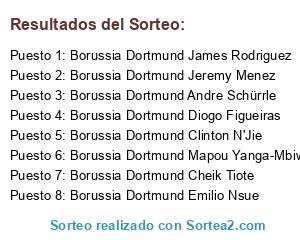 Lista de participantes: Borussia Dortmund Jaineil Hoilet, Borussia Dortmund Neven Subotic, Borussia Dortmund Emilio Nsue, Borussia Dortmund Andre Schürrle, Borussia Dortmund Rui Patricio, Borussia Dortmund James Rodriguez, Borussia Dortmund Fernando Llorente, Borussia Dortmund Ron-Robert Zieler, Borussia Dortmund Jeremy Menez, Borussia Dortmund Diogo Figueiras, Borussia Dortmund Patrick Van Aanholt, Borussia Dortmund Cedrick Mabwati Gerard, Borussia Dortmund Jesus Navas, Borussia Dortmund Mapou Yanga-Mbiwa, Borussia Dortmund Kévin Gameiro, Borussia Dortmund Florentin Pogba, Borussia Dortmund Victor Ibarbo, Borussia Dortmund Clinton N'Jie, Borussia Dortmund Cheik Tiote.