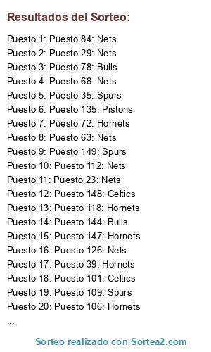 Lista de participantes: Puesto 1: Celtics, Puesto 2: Nets, Puesto 3: Hornets, Puesto 4: Pistons, Puesto 5: Spurs, Puesto 6: Spurs, Puesto 7: Bulls, Puesto 8: Nets, Puesto 9: Bulls, Puesto 10: Spurs, Puesto 11: Spurs, Puesto 12: Hornets, Puesto 13: Hornets, Puesto 14: Hornets, Puesto 15: Hornets, Puesto 16: Celtics, Puesto 17: Spurs, Puesto 18: Celtics, Puesto 19: Nets, Puesto 20: Pistons, Puesto 21: Celtics, Puesto 22: Nets, Puesto 23: Nets, Puesto 24: Hornets, Puesto 25: Pistons, Puesto 26: Celtics, Puesto 27: Nets, Puesto 28: Hornets, Puesto 29: Nets, Puesto 30: Celtics, Puesto 31: Nets, Puesto 32: Celtics, Puesto 33: Nets, Puesto 34: Spurs, Puesto 35: Spurs, Puesto 36: Nets, Puesto 37: Nets, Puesto 38: Spurs, Puesto 39: Hornets, Puesto 40: Hornets, Puesto 41: Bulls, Puesto 42: Spurs, Puesto 43: Hornets, Puesto 44: Nets, Puesto 45: Pistons, Puesto 46: Nets, Puesto 47: Spurs, Puesto 48: Spurs, Puesto 49: Spurs, Puesto 50: Bulls, Puesto 51: Spurs, Puesto 52: Spurs, Puesto 53: Celtics, Puesto 54: Celtics, Puesto 55: Hornets, Puesto 56: Nets, Puesto 57: Celtics, Puesto 58: Celtics, Puesto 59: Pistons, Puesto 60: Nets, Puesto 61: Spurs, Puesto 62: Spurs, Puesto 63: Nets, Puesto 64: Pistons, Puesto 65: Celtics, Puesto 66: Bulls, Puesto 67: Pistons, Puesto 68: Nets, Puesto 69: Hornets, Puesto 70: Nets, Puesto 71: Celtics, Puesto 72: Hornets, Puesto 73: Hornets, Puesto 74: Spurs, Puesto 75: Nets, Puesto 76: Celtics, Puesto 77: Nets, Puesto 78: Bulls, Puesto 79: Hornets, Puesto 80: Nets, Puesto 81: Nets, Puesto 82: Celtics, Puesto 83: Celtics, Puesto 84: Nets, Puesto 85: Spurs, Puesto 86: Hornets, Puesto 87: Hornets, Puesto 88: Spurs, Puesto 89: Nets, Puesto 90: Celtics, Puesto 91: Nets, Puesto 92: Spurs, Puesto 93: Hornets, Puesto 94: Nets, Puesto 95: Celtics, Puesto 96: Hornets, Puesto 97: Spurs, Puesto 98: Spurs, Puesto 99: Hornets, Puesto 100: Nets, Puesto 101: Celtics, Puesto 102: Spurs, Puesto 103: Celtics, Puesto 104: Spurs, Puesto 105: Pistons, Puesto 106: Hornets, Puesto 107: Hornets, Puesto 108: Pistons, Puesto 109: Spurs, Puesto 110: Hornets, Puesto 111: Nets, Puesto 112: Nets, Puesto 113: Spurs, Puesto 114: Nets, Puesto 115: Hornets, Puesto 116: Hornets, Puesto 117: Hornets, Puesto 118: Hornets, Puesto 119: Pistons, Puesto 120: Hornets, Puesto 121: Nets, Puesto 122: Celtics, Puesto 123: Hornets, Puesto 124: Pistons, Puesto 125: Spurs, Puesto 126: Nets, Puesto 127: Celtics, Puesto 128: Hornets, Puesto 129: Hornets, Puesto 130: Bulls, Puesto 131: Pistons, Puesto 132: Spurs, Puesto 133: Spurs, Puesto 134: Pistons, Puesto 135: Pistons, Puesto 136: Nets, Puesto 137: Spurs, Puesto 138: Celtics, Puesto 139: Spurs, Puesto 140: Pistons, Puesto 141: Bulls, Puesto 142: Spurs, Puesto 143: Spurs, Puesto 144: Bulls, Puesto 145: Celtics, Puesto 146: Spurs, Puesto 147: Hornets, Puesto 148: Celtics, Puesto 149: Spurs.