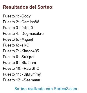 Lista de participantes: -sikO, -felipit0, -Statham, -Cody, -DjMummy, -Sukipei, -Seemann, -Miguel, -Dogmasakre, -RaulSFC, -Kinton405, -Camino88, -Dstroy.