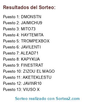 Lista de participantes: JAVINR10, FINESTRAT, KAPYKUA, HAYTEMITA, MITO73, JAIMICHU9, AKETEKLESTU, ALEAD71, ZIZOU EL MAGO, VIUSO X, TROMPEXBOX, JAVILENTI, DMONSTN.