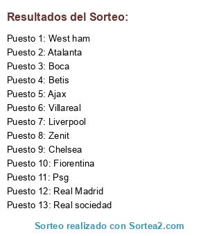 Lista de participantes: Betis, Atalanta, Liverpool, West ham, Fiorentina, Villareal, Real Madrid, Boca, Real sociedad, Ajax, Chelsea, Psg, Zenit.