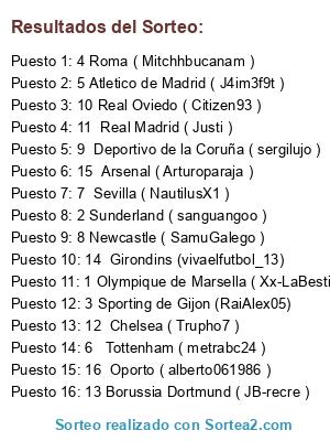 Lista de participantes: 1 Olympique de Marsella ( Xx-LaBestia-xX ), 2 Sunderland ( sanguangoo ), 3 Sporting de Gijon (RaiAlex05), 4 Roma ( Mitchhbucanam ), 5 Atletico de Madrid ( J4im3f9t ), 6 Tottenham ( metrabc24 ), 7 Sevilla ( NautilusX1 ), 8 Newcastle ( SamuGalego ), 9 Deportivo de la Coruña ( sergilujo ), 10 Real Oviedo ( Citizen93 ), 11 Real Madrid ( Justi ), 12 Chelsea ( Trupho7 ), 13 Borussia Dortmund ( JB-recre ), 14 Girondins (vivaelfutbol_13), 15 Arsenal ( Arturoparaja ), 16 Oporto ( alberto061986 ).