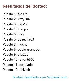 Lista de participantes: pablo-granado, viwy206, capi17, juanpor, vilu206, cosecha83, chivichi, jvvg, alesito, stron5800, : kicho, eskayolo.