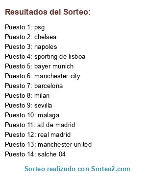 Lista de participantes: barcelona, chelsea, manchester city, milan, atl de madrid, napoles, sevilla, bayer munich, real madrid, salche 04, malaga, manchester united, sporting de lisboa, psg.